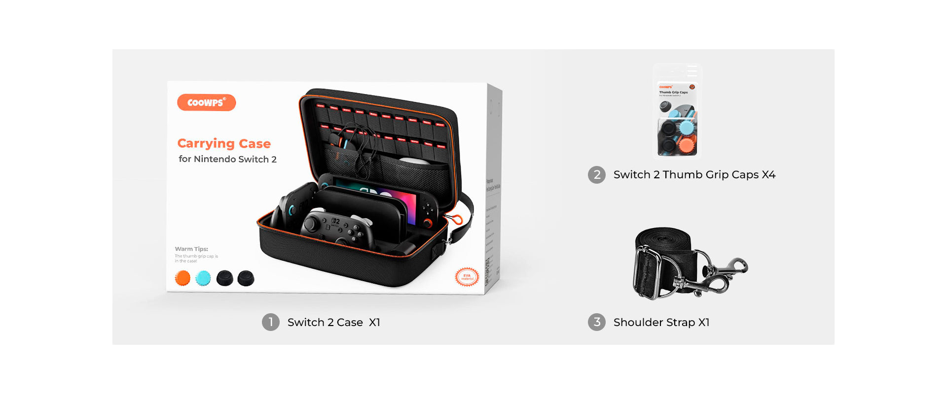 - Package Includes: Comes with a Switch 2 storage case and shoulder strap, 4PCS Switch 2 Thumb Grip Caps. Please note that the Switch 2 accessories shown in the images are for demonstration purposes only and are not included in this case