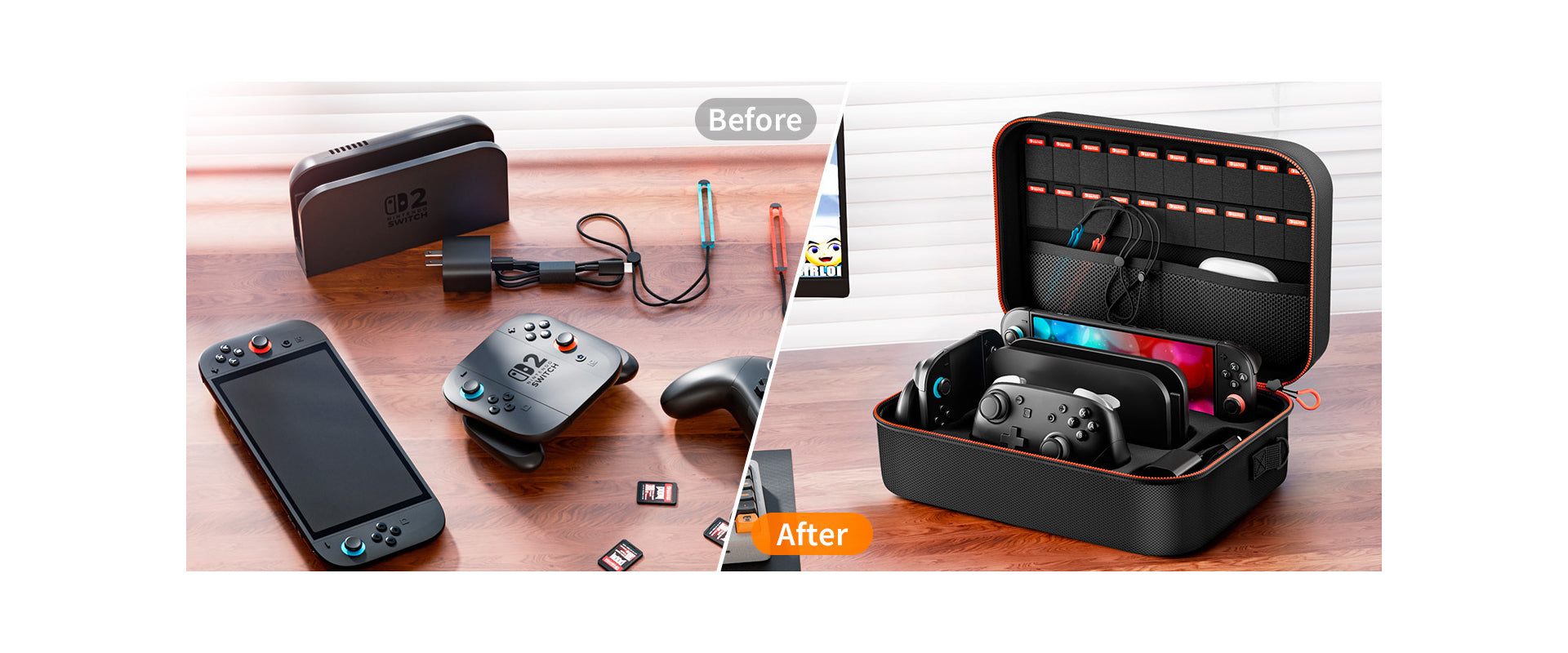 Built for Gamers Who Take It All: This Switch 2 carrying case fits everything you need in one organized spot. With custom-molded compartments for your Switch 2 console, Switch 2 Joy-Con grip, Switch 2 Pro Controller, Switch 2 dock, charger adapter, HDMI Cable and up to 18 game cards, a built-in mesh pocket for extra accessories