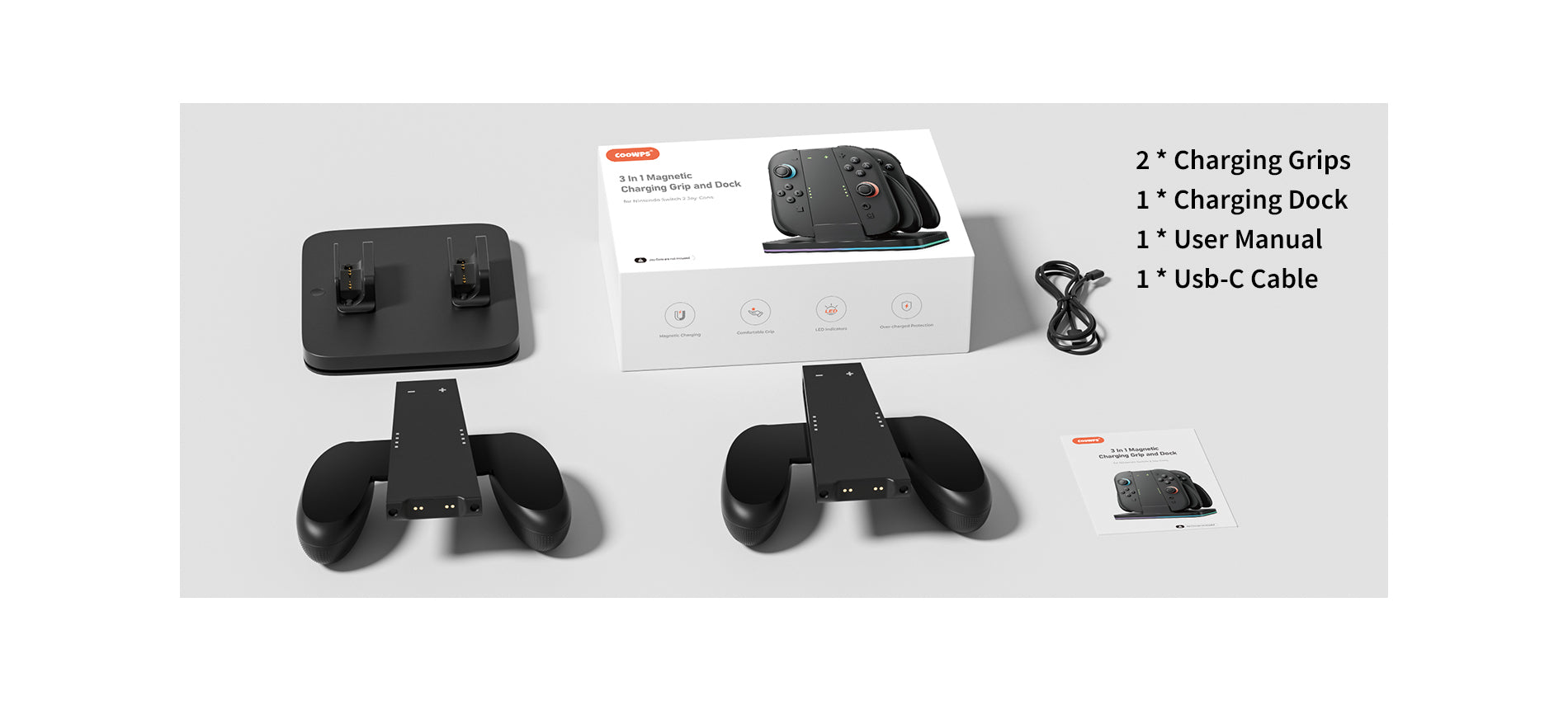 Answer: The COOWPS 3-in-1 Charging Grip and Dock set includes a charging grip that allows you to charge your Joy-Con controllers while using them, a docking station for your Nintendo Switch 2 console, and a convenient stand for comfortable gameplay. This all-in-one package provides enhanced functionality and portability for your gaming experience.