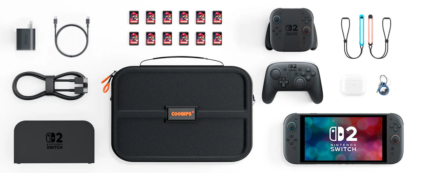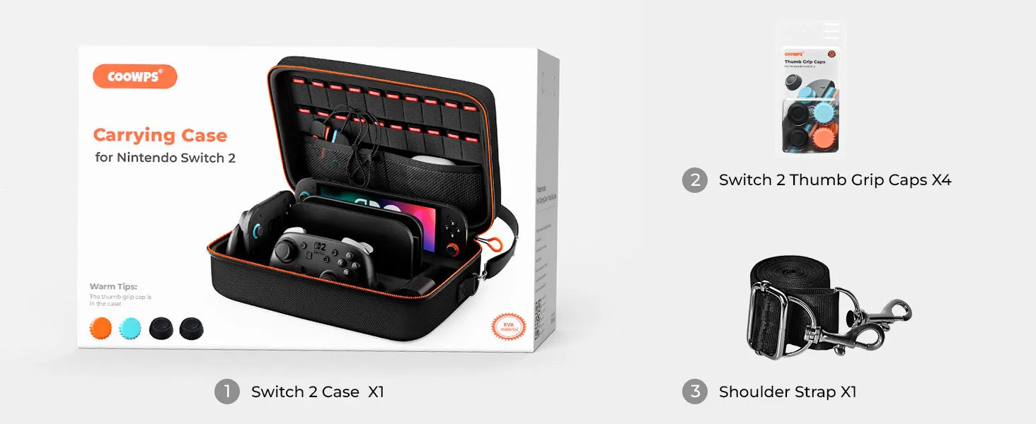 Package Includes: Comes with a Switch 2 storage case and shoulder strap, 4PCS Switch 2 Thumb Grip Caps. Please note that the Switch 2 accessories shown in the images are for demonstration purposes only and are not included in this case